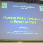 Max Watson, profesor na Wolfson Collegeu, Oxford, in izredni profesor na Chantham Houseu (Kraljevi institut za zunanje zadeve) je predaval o zadnjih gibanjih na svetovnih finančnih trgih in vplivih na evropsko gospodarstvo. Max Watson je bil pred tem svetovalec Evropske komisije na direktoratu za gospodarske in finančne zadeve, 22 let pa je delal za Mednarodni denarni sklad, tudi kot vodja misij v različnih evropskih državah. Zdaj se ukvarja predvsem z gospodarskimi odnosi med ZDA in Evropo ter pacifiškim območjem. Tem relacijam je bilo v luči zadnjih gibanj na finančnih trgih posvečeno tudi njegovo predavanje na Ekonomski fakulteti z naslovom: Financial Turbulence: Is Europe at Risk?