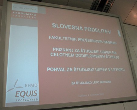 Na Ekonomski fakulteti Univerze v Ljubljani smo podelili fakultetne Prešernove nagrade, priznanja in pohvale za študijsko leto 2007/08. Nagrajence je najprej nagovoril dekan Ekonomske fakultete, prof. dr. Dušan Mramor, in jim čestital za študijske dosežke. Za popestritev večera pa je poskrbel kitarski duo Srednje glasbene in baletne šole Ljubljana v sestavi Sandre Štern in Jureta Cerkovnika, pod mentorstvom profesorja Antona Črnuglja.