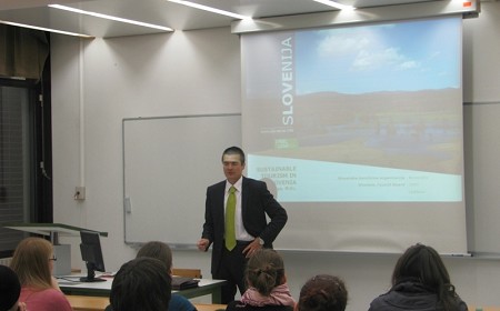 Mag. Dimitrij Piciga, direktor Slovenske turistične organizacije je predaval študentom predmeta Trajnostni turizem in študentom mednarodnega predmeta Sustainable tourism. Predavanje in diskusija je bila o tem kako zelen (trajnosten) je slovenski turizem in kakšna je pri tem vloga STO. Mobilizacijsko zeleno geslo STOja je “Slovenija je zelena, gre zeleno pot in se tako tudi promovira” (Slovenia is green, goes green and promotes green).
