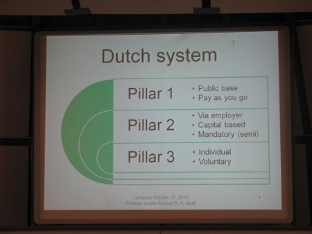 Nizozemski pokojninski sistem, ki je sestavljen iz treh stebrov, je eden izmed najuspešnejših na svetu, vendar se sedaj prav tako, kot v Sloveniji, ukvarjajo z vprašanjem, kako sistem prilagoditi demografskim spremembam. Prof. dr. Arnoud W. A. Boot je poudaril, da je izredno pomembno kako vlada sporoči javnosti, da je daljše ostajanje v delovni aktivnosti nujno ter obrazloži, da se je sicer možno upokojiti prej vendar se za to plača določeno ceno.