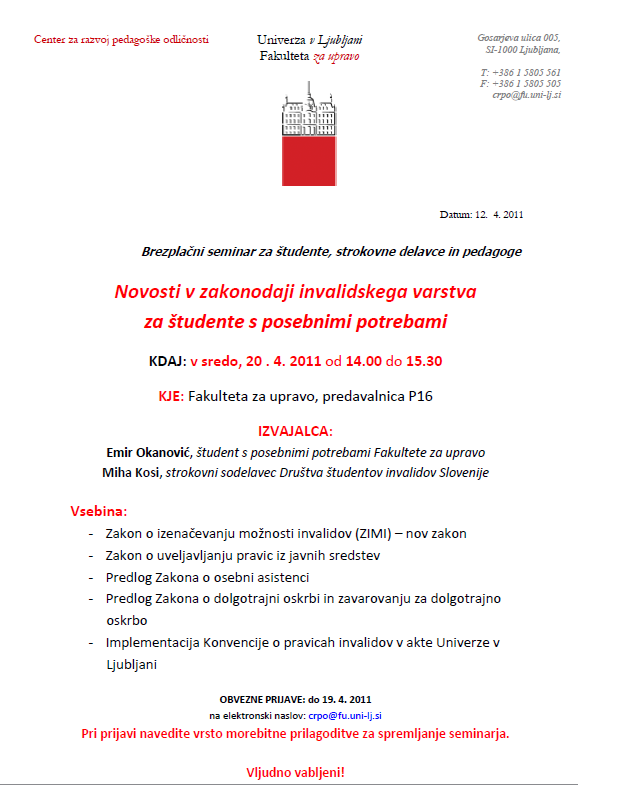 Center za razvoj pedagoške odličnosti Fakultete za upravo organizira brezplačni seminar za študente, strokovne delavce in pedagoge z naslovom “Novosti v zakonodaji invalidskega varstva za študente s posebnimi potrebami”. Seminar bo potekal v sredo, 20. aprila 2011 od 14. do 15.30 ure, na Fakulteti za upravo v predavalnici P16.