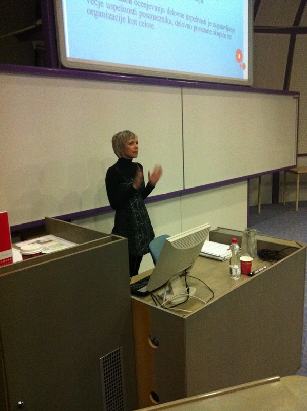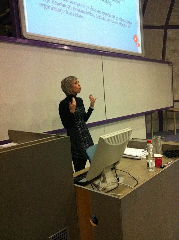 Gostja Lea Štimec, mag. posl. ved je podiplomskim študentom predavala na temo »Ocenjevanje in nagrajevanje delovne uspešnosti s poudarkom v javnem sektorju«. Gostja je aktualno predavanje s praktičnimi primeri in zgledi iz prakse javnega sektorja sklenila s tezo, da z jasno opredeljenimi merili za ocenjevanje delovne uspešnosti in strokovne usposobljenosti ocenjevalcev v javnem sektorju ter s spremembami in dopolnitvami nacionalne zakonodaje lahko izboljšamo v praksi pogosto uporabljen pristop ocenjevanja in povečamo motivacijski učinek na zaposlene v javnem sektorju. Gostji se najlepše zahvaljujemo za njeno strokovno in aktualno predavanje ter izkazano odprto sodelovanje s študenti in fakulteto.