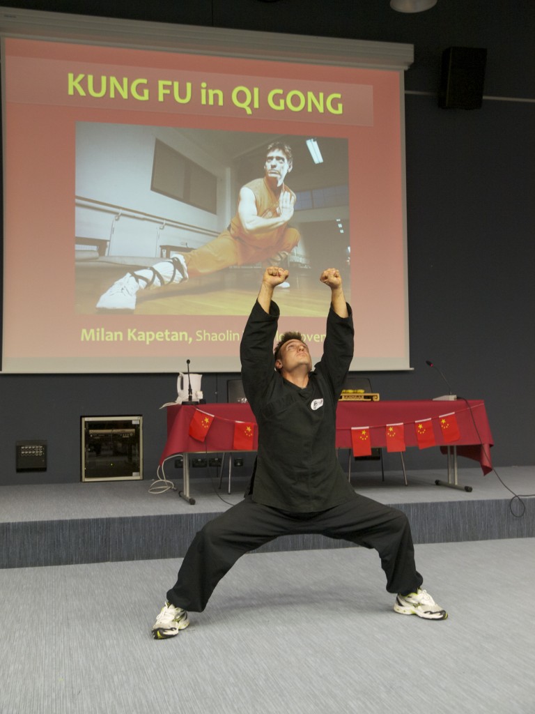 Program se je začel z pozdravim nagovorom organizatorjev kitajskega dne. V nadaljevanju nam je gospod Milan Kapetan iz Shaolin Templja Slovenija predstavil Qi Gonga in Kung Fu. Ustanovitelj Slovenskega združenje taijiquan hram CSN, gospod Chen Shining, nam je prikazal Taiji – vadbo, ki vključuje znanje davnih kitajskih mojstrov, in navedel tudi razloge pomembnosti vadbe.