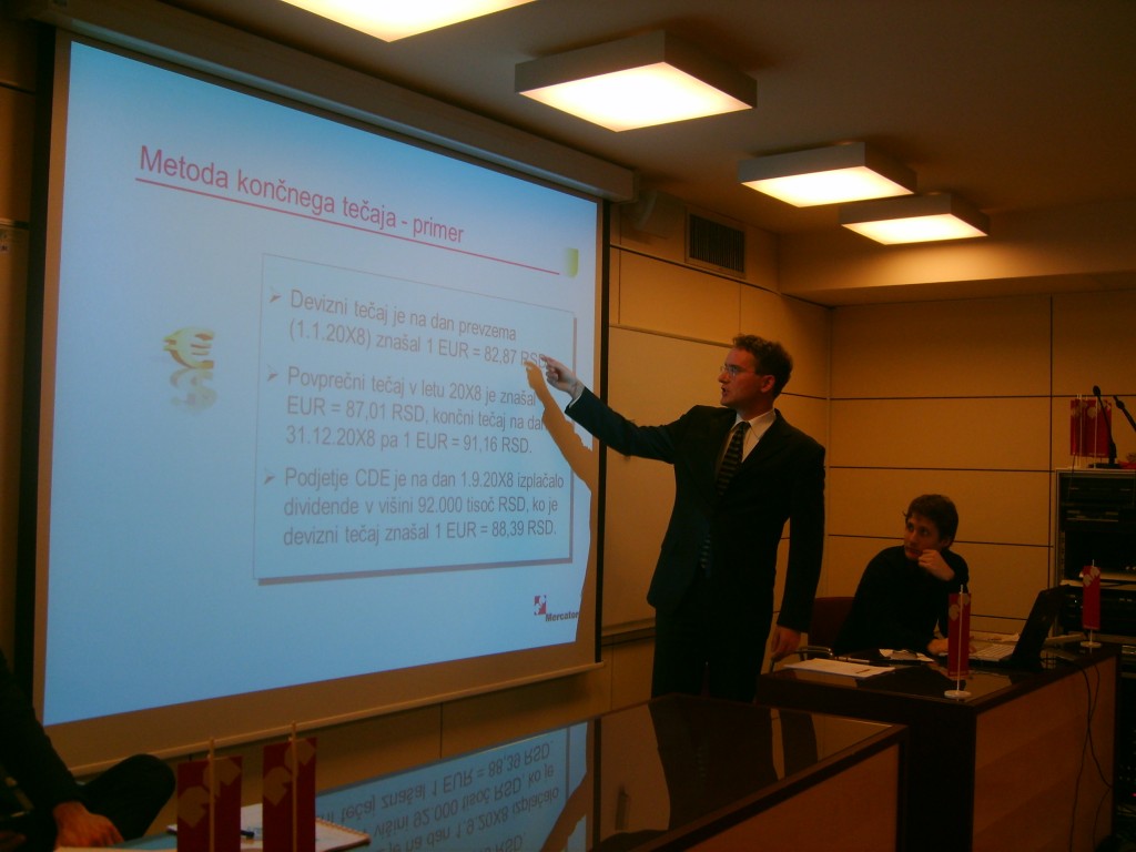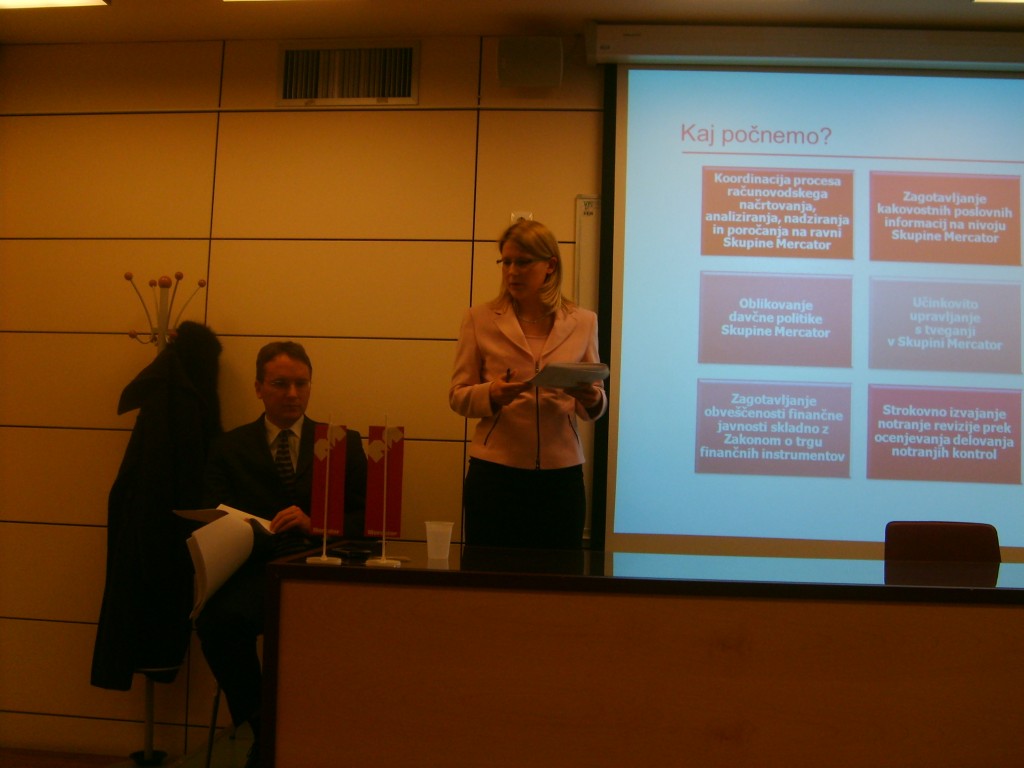 Študentje 3. letnika računovodske smeri so že drugo leto zapored s prof. dr. Sergejo Slapničar obiskali podjetje Mercator in sicer službo za računovodstvo in kontroling. Direktorica oddelka gospa Andreja Cedilnik jim je uvodoma predstavila skupino Mercator in funkcije nadzora in računovodskega poročanja, ki jih opravlja njihova služba. Nato je Jernej Česen predstavil vrednotenje odvisnih družb in oblikovanje rezervacij ter Gregor Čerček problem konsolidiranja tujih odvisnih družb, tečajnih razlik in ščitenja pred valutnimi tveganji. Nadzor nad veliko skupino, razpršeno po širokem geografskem področju je zahtevna stvar, v Mercatorju ga uspešno opravlja le 12 zaposlenih v računovodstvu in notranji reviziji. Študentje so bili nad to informacijo impresionirani. Vsak študent je od Mercatorja dobil tudi darilo, in sicer USB ključek.