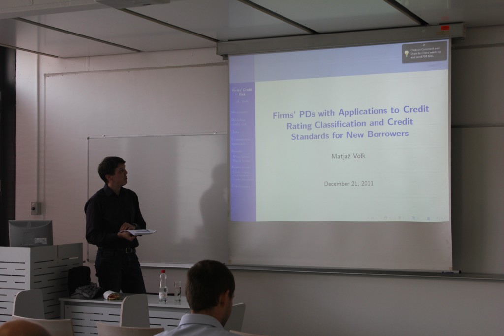 V sredo, 21. decembra, je na Ekonomski fakulteti potekal Znanstveno – raziskovalni seminar. Matjaž Volk, dipl.ekon. je predaval na temo: “Firms’ PDs with Applications to Credit Rating Classification and Credit Standards for New Borrowers.