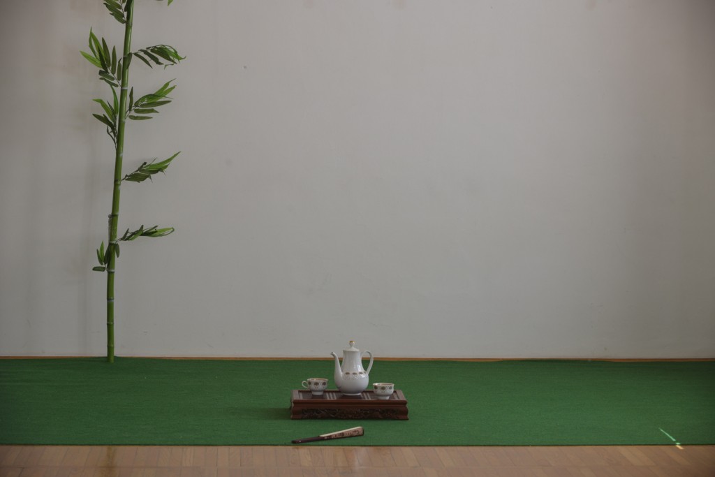 »Ob čaju« ni samo vizualna predstava, ampak vsebuje še bolj pomemben vsebinski del avtorjevega umetniškega zaznavanja o izkušnjah lastnega obstoja in vsakodnevnega slabšanja naravnega okolja, o idejah o zahodni in kitajski kulturi ter pogledih na zgodovino in družbeni razvoj, med katerimi so tudi izzivi za samega sebe. Z lastnim obnašanjem na vizualni način umetnika izražata svoje vrednostne ideje, kar lahko vzbudi razmišljanje o našem družbenem okolju v sedanjem času pehanja za dobički in potrošništva.