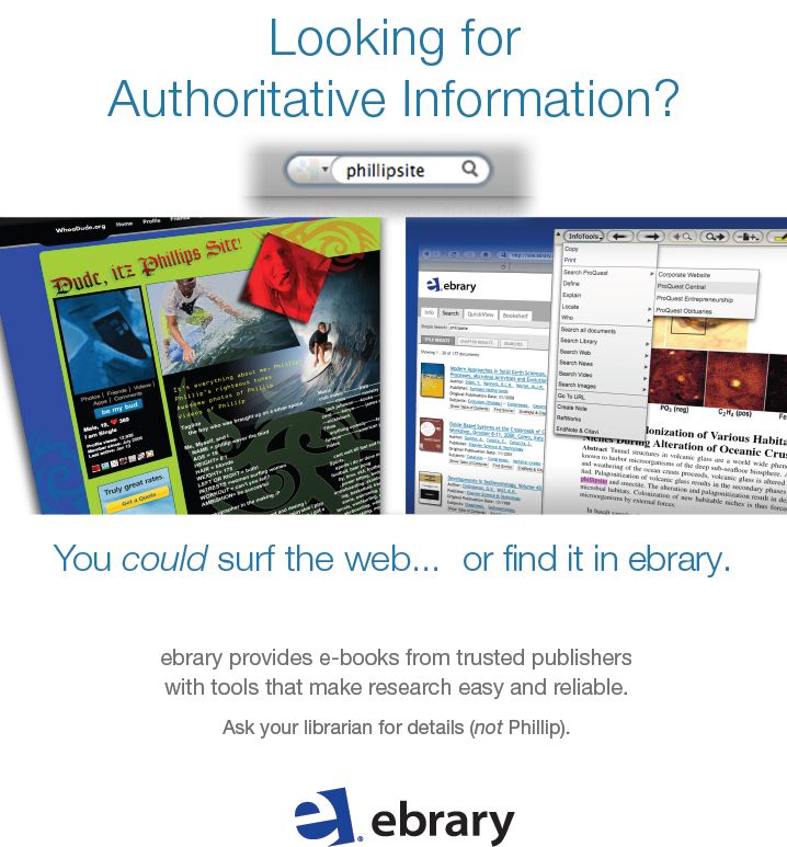 Centralna ekonomska knjižnica vas v ponedeljek, 15. oktobra 2012, ob 13. uri vabi v družbo Iuliana Herciua, predstavnika informacijskega ponudnika ProQuest, ki bo predstavil zbirko elektronskih knjig, dostopnih na portalu ebrary. Zbirka pokriva več kot 13.000 e-knjig, ki so našim uporabnikom dostopne tudi od doma.