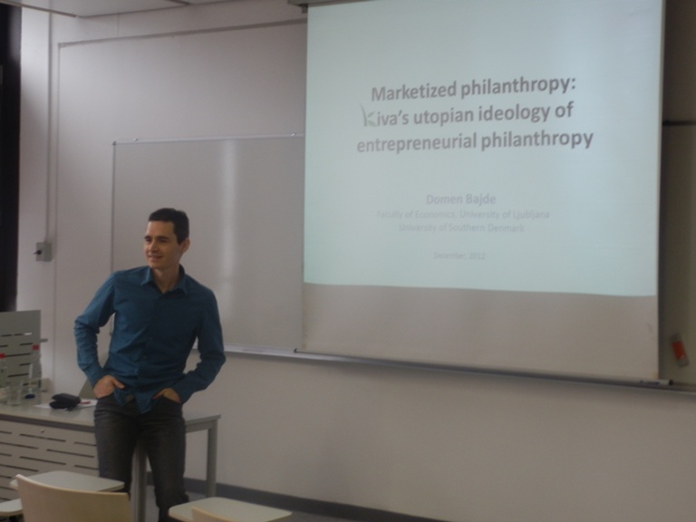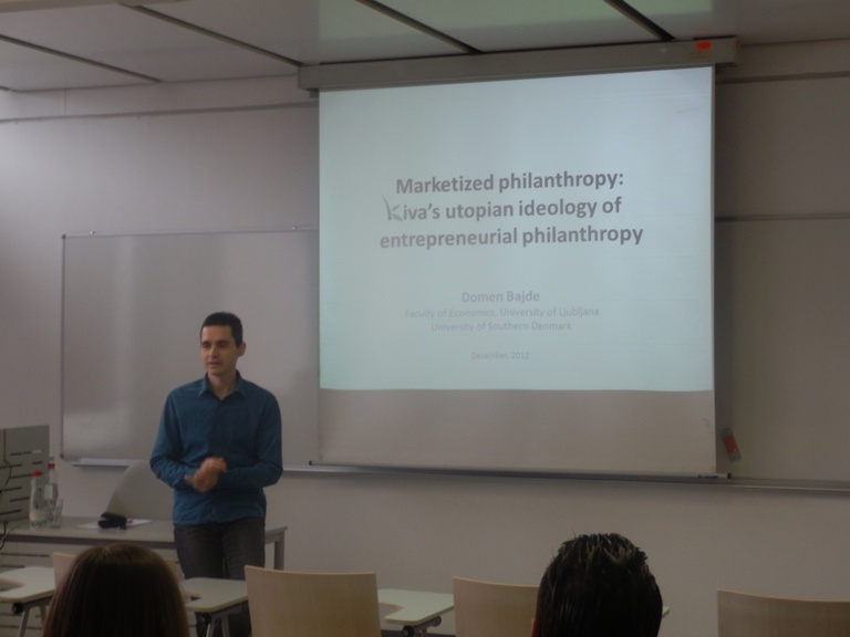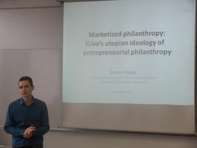 V četrtek 20.12. je doc. dr. Domen Bajde (EF), predstavil članek: ˝Marketized philanthropy: Kiva’sutopian ideology of entrepreneurial philanthropy˝.