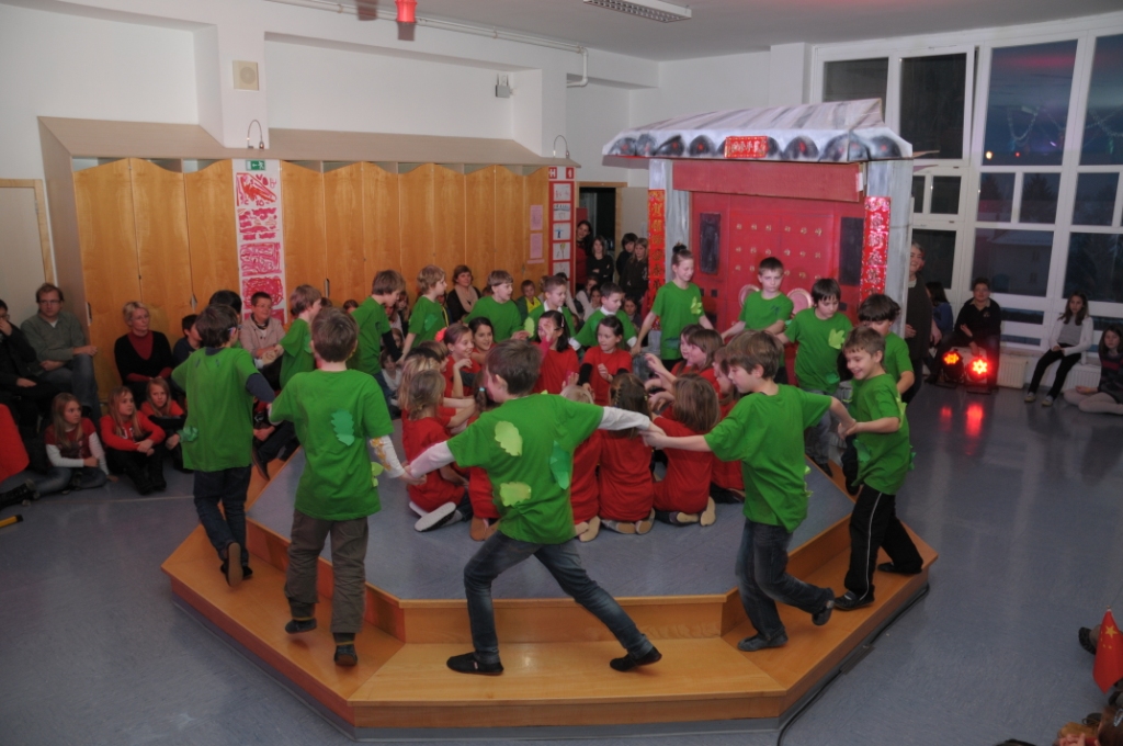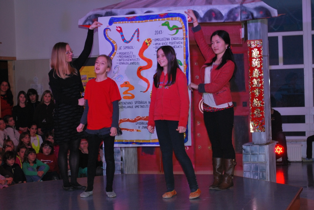 Učenci OŠ Trnovo, OŠ Koseze in OŠ Toneta Čufarja, ki obiskujejo interesno dejavnost Spoznavanje kitajske kulture in jezika, so gostom na izjemno zanimiv način predstavili značilnosti kitajskega Praznika pomladi, legendo o pošasti Nian, jim razodeli kaj prinaša leto vodne kače ter pričarali kitajsko družinsko vzdušje v času kitajskega novega leta. Učenci prve in druge triade OŠ Trnovo so goste z ITG-jem (izraz telesa ob glasbi) popeljali v pravljični svet ob pesmi Polno veselja, učenci tretje triade pa so s plesom iz predstave Pravljična knjiga še dodatno očarali občinstvo. Pesem Srečno novo leto, ki so jo skupaj zapeli učenci vseh treh osnovnih šol, je praznično vzdušje privedla do vrhunca. Vsem smo