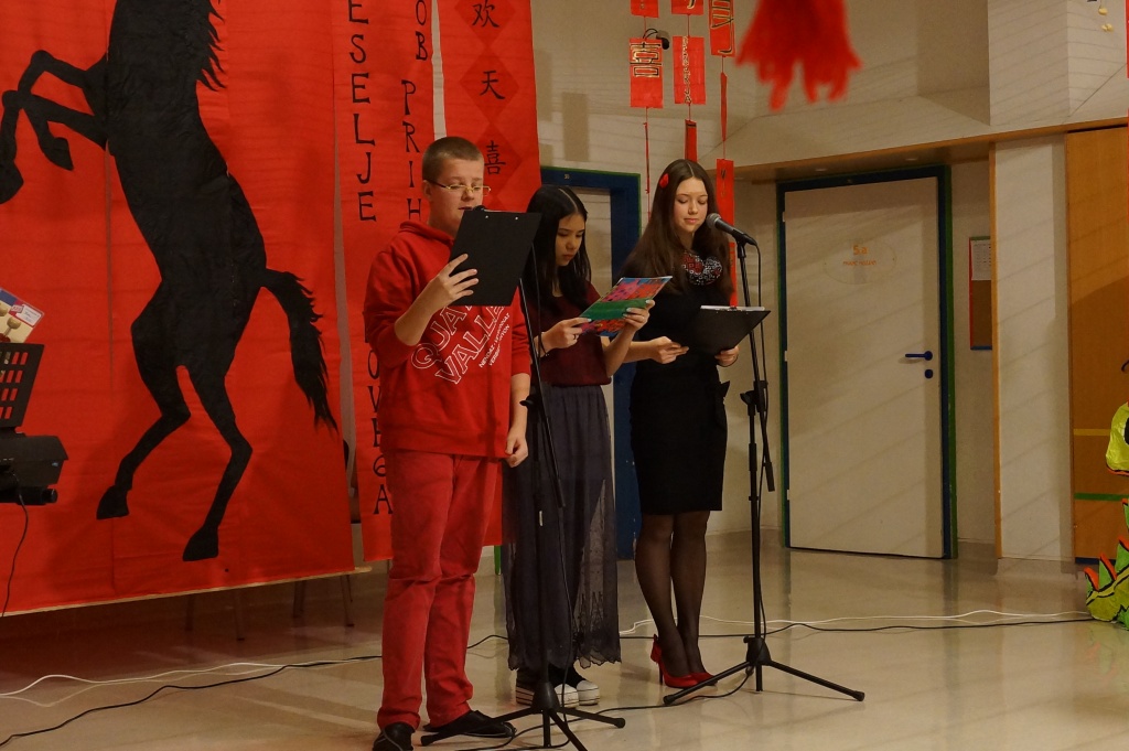 Učenci OŠ Toneta Čufarja, OŠ Trnovo in OŠ Koseze, ki obiskujejo interesno dejavnost Spoznavanje kitajske kulture in jezika, so gostom na izjemno zanimiv način predstavili značilnosti kitajskega Praznika pomladi, legendo o pošasti Nian in jim razodeli kaj prinaša leto konja. Skozi predstavitve kitajske tradicije in kulture, kitajsko pesem in odlično avtorsko plesno predstavo »Univerzum« so pričarali praznično vzdušje.