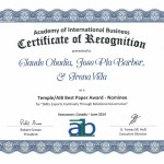 Članek prof. dr. Irene Vida in soavtorjev Claudeja Obadia (ESCE, Paris) in Joseja Pla-Barberja (University of Valencia) z naslovom “SMEs Exports Continuity Through Relational Governance” je bil na letni konferenci Association of International Busiess (AIB) s tematiko “Local Coontext in Global Business”, nominiran za »Temple/AIB Best paper Award«. Na konferenci, ki je bila junija v Vancouver-u, Kanada, je bilo predstavljenih 700 »competitive papers«, od tega pa za zgoraj omenjeno nagrado, nominiranih le 13.