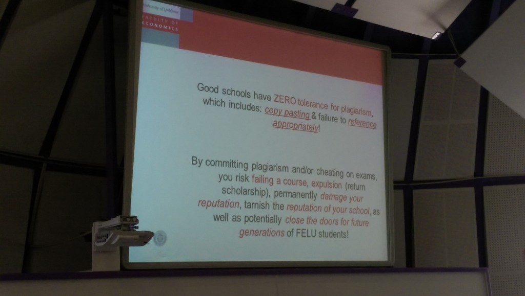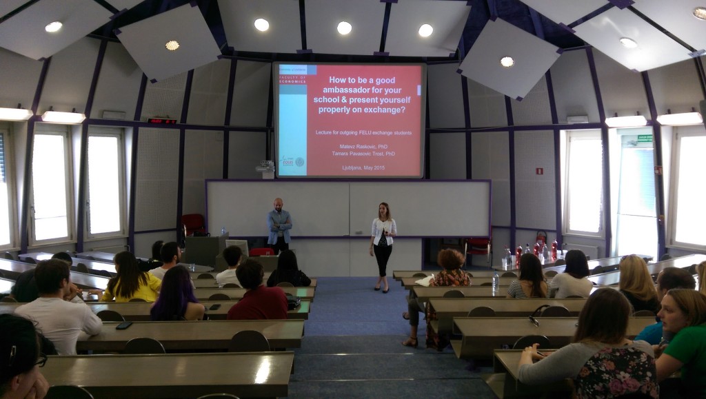 V četrtek, 7. maja 2015 je na Ekonomski fakulteti potekal seminar z naslovom »How to be a good ambasador while being abroad«, ki ga je organizirala služba za mednarodno sodelovanje za študente, ki odhajajo na študijsko izmenjavo v prihodnjem študijskem letu 2015/16. Študenti so na seminarju, ki sta ga vodila prof. dr. Matevž Rašković in prof. dr. Tamara Trošt, izvedeli, kako učinkovito zastopati svojo državo oz. fakulteto v tujini, kako predstaviti sebe in navezati stike z ostalimi študenti, s profesorji in domačini, ter zakaj je to tako pomembno. Oba predavatelja sta iz prve roke delila svoje izkušnje z dojemanjem tujih držav in različnih kultur, ki sta si jih pridobila bodisi s študijem ali pa z obiski in predavanji na tuji instituciji. Po končanem seminarju je sledilo sproščeno druženje.