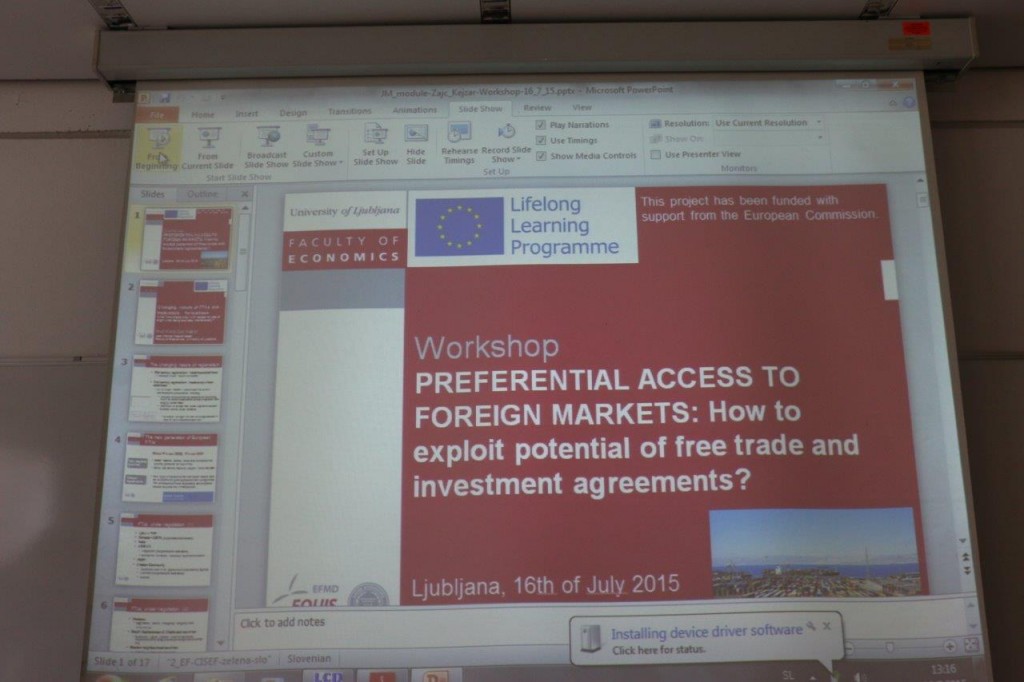 V četrtek, 16. julija 2015, je na Ekonomski fakulteti v mednarodnem vzdušju poletne šole potekala delavnica o priložnostih, ki jih podjetjem prinašajo prostotrgovinski in investicijski sporazumi. Delavnica je bila organizirana v okviru Jean Monnet projekta Understanding the potential of the EU-India Free Trade Agreement, ki ga vodi profesorica Katja Zajc Kejžar in se izvaja v okviru poletne šole na Ekonomski fakulteti.