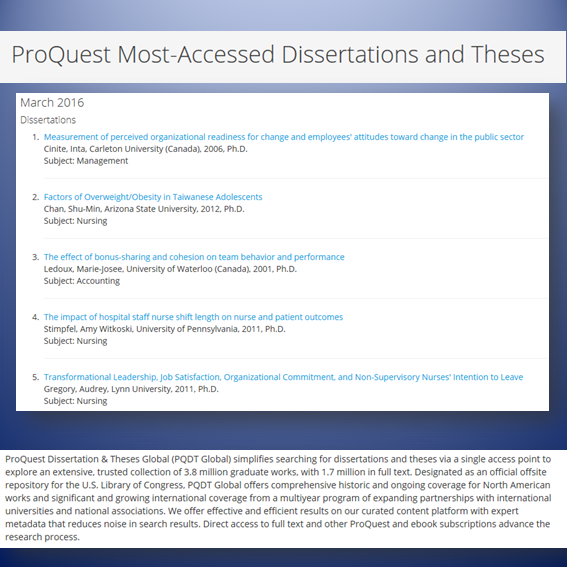 ProQuest je vsem knjižnicam konzorcija IZUM od 9. do 23. maja 2016 omogočil prost dostop do besedil v zbirki ‘Proquest Dissertations and Thesis: Global’, kjer so zbrana univerzitetna dela iz 88 držav.