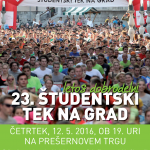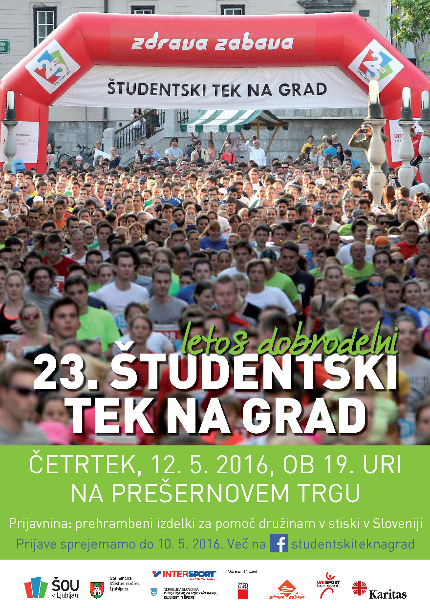 V četrtek, 12. maja vas vabimo na tradicionalni študentski tek po ljubljanskih ulicah od Prešernovega trga do Ljubljanskega gradu. Traso dolgo 2,5 km je v 22-ih tekaških izvedbah preteklo že več kot 20.000 tekačic in tekačev. Prvih 1.800 udeležencev prejme spominsko majico 23. Študentskega teka na grad. Letos bo Študentski tek na grad tudi dobrodelen. Pod geslom „Sem študent in pomagam” bomo zbirali prehrambene izdelke za slovenske družine v stiski. Pridruži se nam tudi ti.