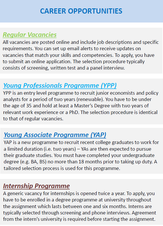 Interni razpis za prakse je objavljen 2x letno na spletnih straneh Ekonomske fakultete. Zaradi številnih kakovostnih prijav v preteklih letih so se predstavniki OECD-ja odločili, da nas v letošnjem letu obiščejo in predstavijo možnosti sodelovanja in potek prakse in YPP zaposlitve v OECD za naše študente in diplomante.
