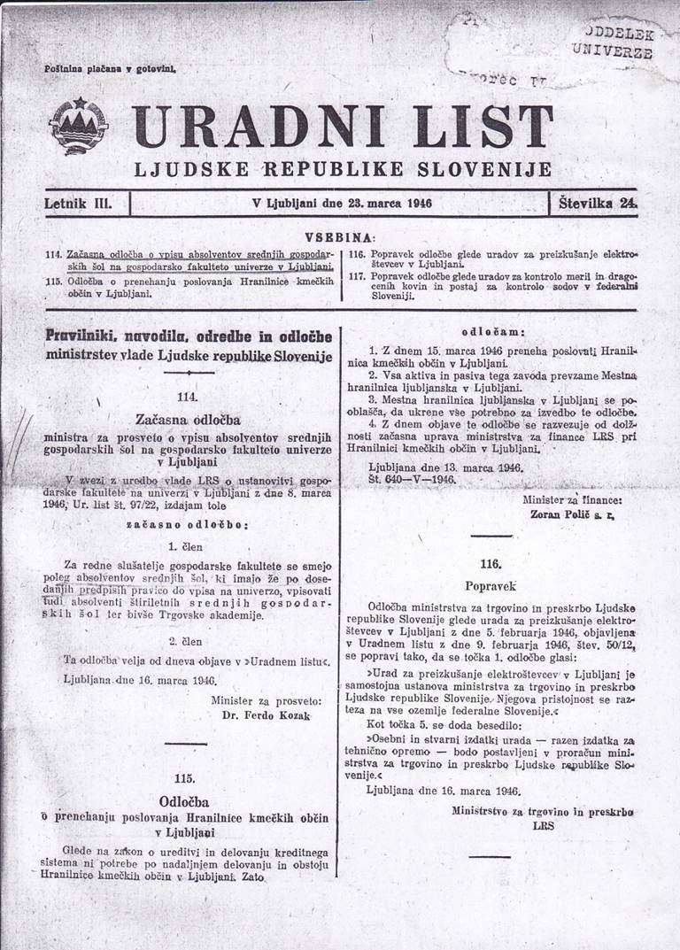 - Fotokopija začasne odločbe Ministrstva za prosveto dr. Ferda Kozaka o vpisu na Gospodarsko fakulteto Univerze v Ljubljani – 1946