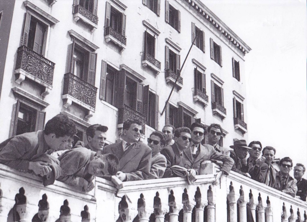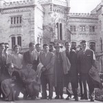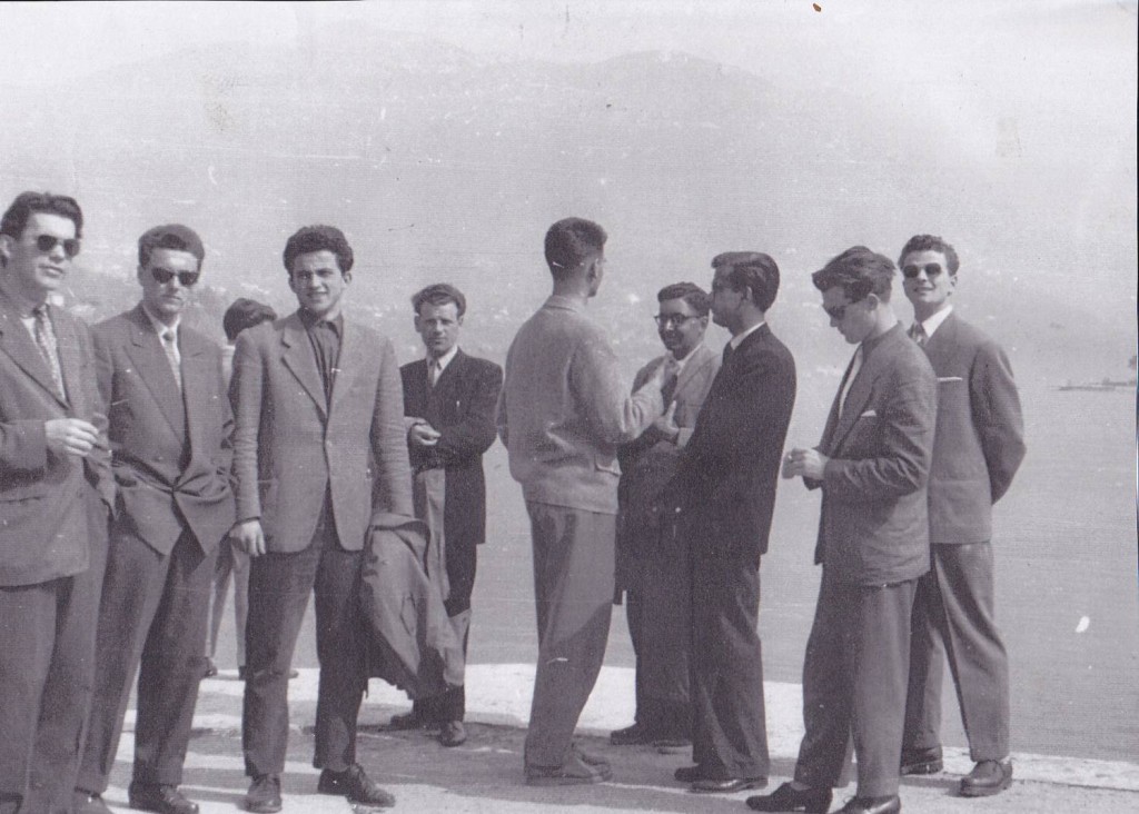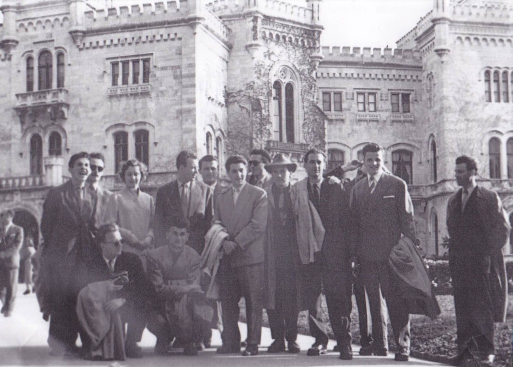 - Izlet študentov Ekonomske fakultete Univerze v Ljubljani leta 1956 v Milano; na tej poti so se ustavili v Trstu. Z leve proti desni stojijo: Franc Štrumbelj, Andrej Miklavčič, Milan Gregorič, Dušan Šinigoj, Bojan Prek, zadnja dva sta Dolfe Vojsk in Ivan Lapajne.