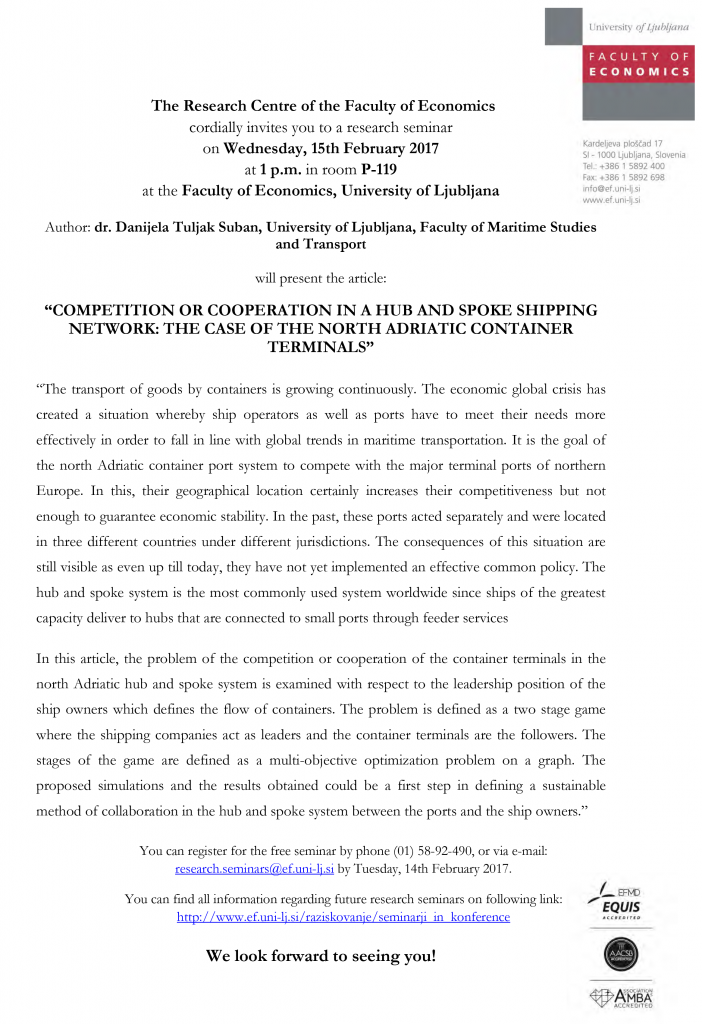 – v sredo, 15.2.2017 ob 13h v predavalnici P-119, bo dr. Danijela Tuljak Suban, University of Ljubljana, Faculty of Maritime Studies and Transport, predstavila članek: “COMPETITION OR COOPERATION IN A HUB AND SPOKE SHIPPING NETWORK: THE CASE OF THE NORTH ADRIATIC CONTAINER TERMINALS ”
