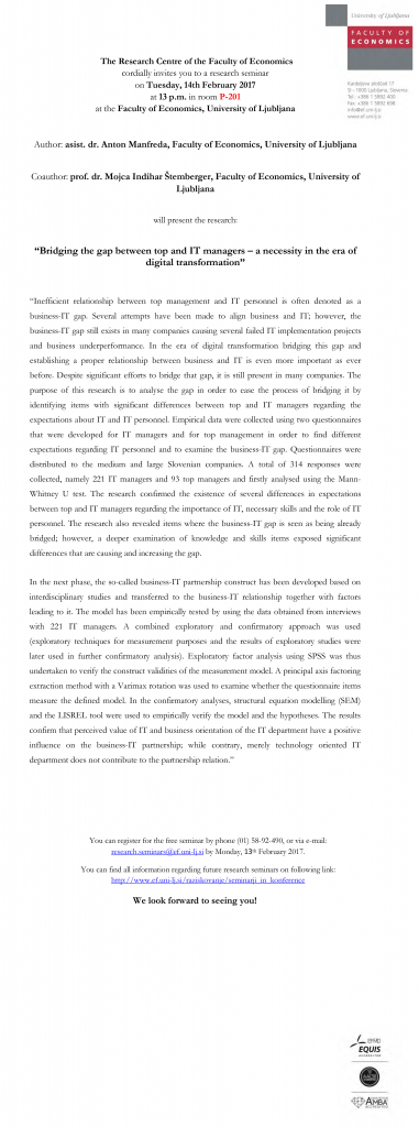 – v torek, 14.2.2017 ob 13h v predavalnici P-201, bo asist. dr. Anton Manfreda, Faculty of Economics, University of Ljubljana predstavil raziskavo: “Bridging the gap between top and IT managers – a necessity in the era of digital transformation”