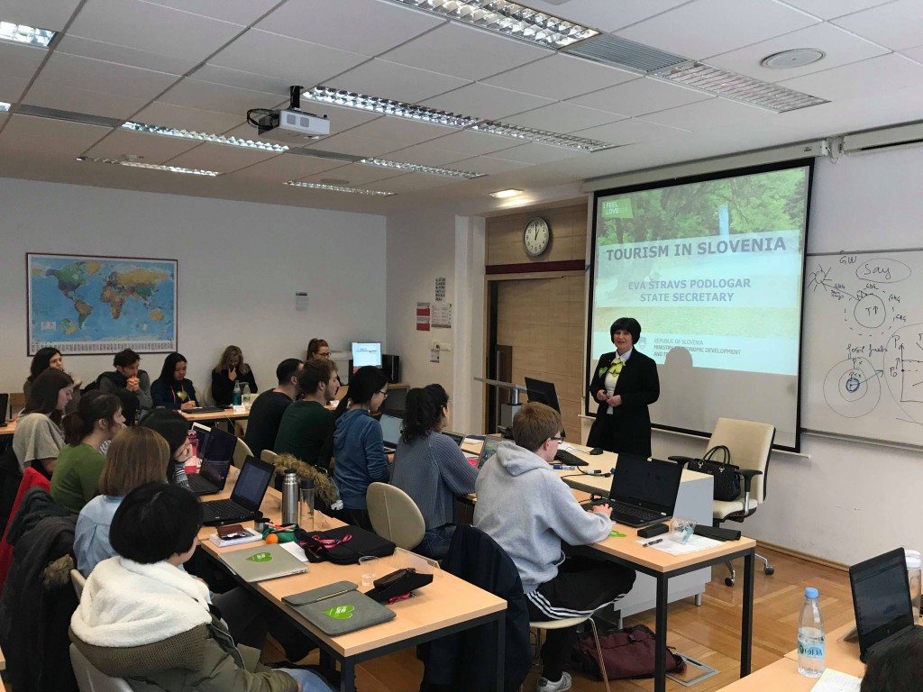 Državna sekretarka Eva Štravs Podlogar je v sredo, 7. februarja 2018 predavala tujim študentom magistrskega programa Evropski turistični management na Ekonomski fakulteti v Ljubljani.