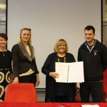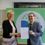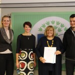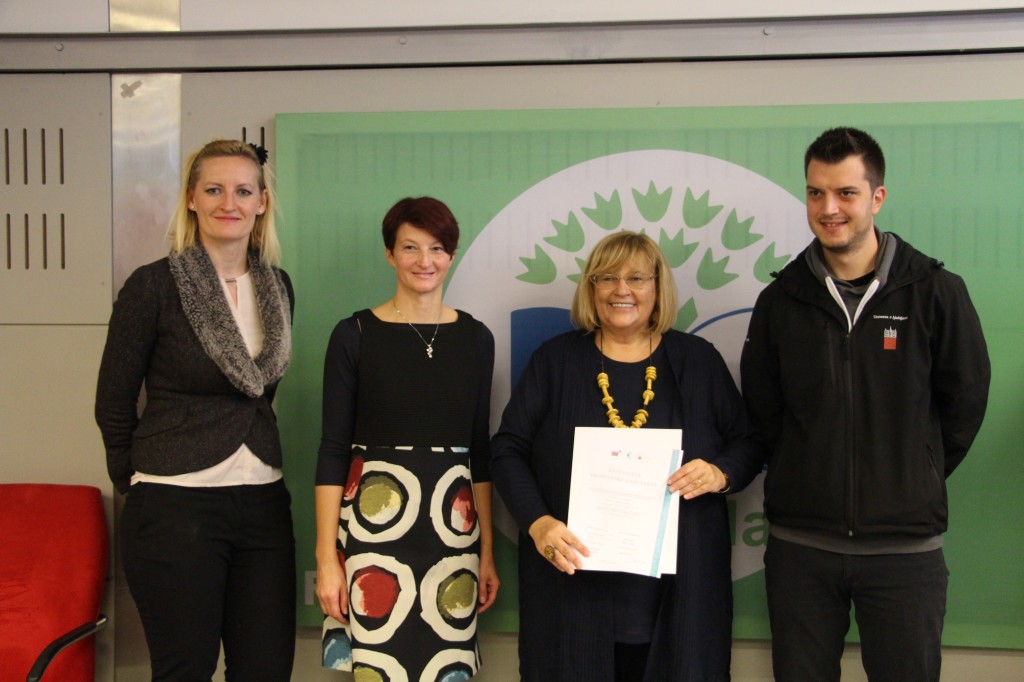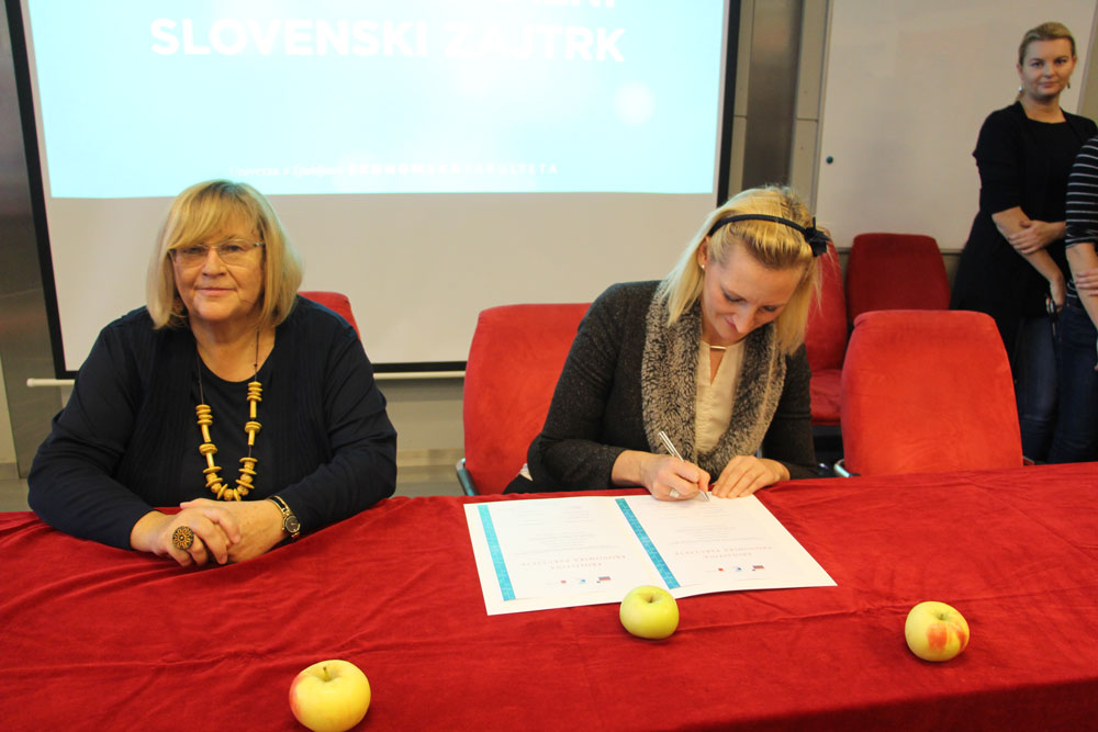 Lucija Marovt, koordinatorica programa Ekošola za fakultete, je vsem zbranim čestitala za izjemen uspeh. Izpostavila je, da smo med članicami Univerze v Ljubljani druga fakulteta, ki si je prislužila zastavo s svojim ekološkim delovanjem in namerami za prihodnost. Povedala je, da institucije običajno potrebujejo dve leti, da izpolnijo vseh sedem korakov za osvojitev zelene zastave. Ekonomska fakulteta je bila izjemna tudi pri tem programu, saj je vse zahteve izpolnila že v enem letu. Posebej se je zahvalila vodstvu Ekonomske fakultete, saj brez njegove zaveze program ne bi bil tako uspešen. Še posebej pa je povabila študente, naj še naprej aktivno sodelujejo v programu Ekošola, saj so bili prav oni tisti, ki so ga pripeljali na fakultete. Mag. Nataša Mulec, koordinatorica programa Ekošola na Ekonomski fakulteti, je zaposlenim na kratko predstavila načrte programa v študijskem letu 2018/2019 ter se zahvalila vodstvu za podporo, zaposlenim pa za izjemen odziv in sodelovanje v aktivnostih. Nato je sledil slavnostni podpis ekolistine, ki so jo v imenu vseh zaposlenih, študentov in diplomantov podpisali dekanja prof. dr. Metka Tekavčič, predsednik Študentskega sveta Ekonomske fakultete Rok Smrekar, nacionalni koordinator programa Ekošola mag. Gregor Cerar in mag. Nataša Mulec, koordinatorica programa Ekošola na Ekonomski fakulteti. Slavnostni dogodek se je zaključil s fotografiranjem ob zeleni zastavi in prijetnim druženjem ob dobrotah, ki sestavljajo tradicionalni slovenski zajtrk.