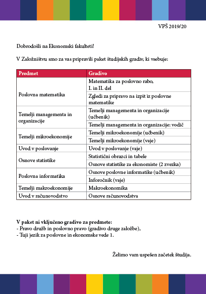 Le še do srede, 30. 10. 2019, lahko v Centralni ekonomski knjižnici kupite paket študijskih gradiv za VPŠ ali UPEŠ za 1. letnik po 20 % nižji ceni
