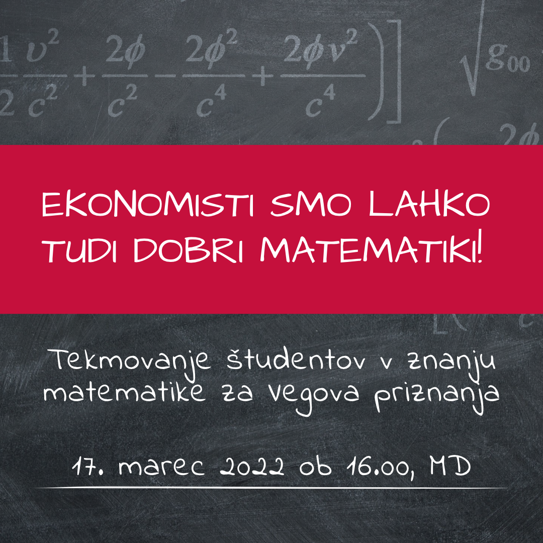 V četrtek, 3. marca 2022, se bodo odprle prijave na tekmovanje študentov v znanju matematike za Vegova priznanja, ki ga organizira Društvo matematikov, fizikov in astronomov Slovenije. Tekmovanje, ki letos na Ekonomski fakulteti poteka četrtič, bo v četrtek, 17. marca 2022, ob 16. uri, v Mali dvorani.