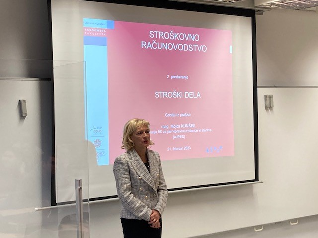 Pri predmetu Stroškovno računovodstvo, ki ga izvaja mag. Aleksander Igličar v 3. letniku računovodske smeri na dodiplomskem študiju UPEŠ in VPŠ programa, je v torek, 21. februarja 2023 kot gostujoča predavateljica predavala gospa mag. Mojca Kunšek, direktorica AJPES-a, s predavanjem Obračun stroškov dela.