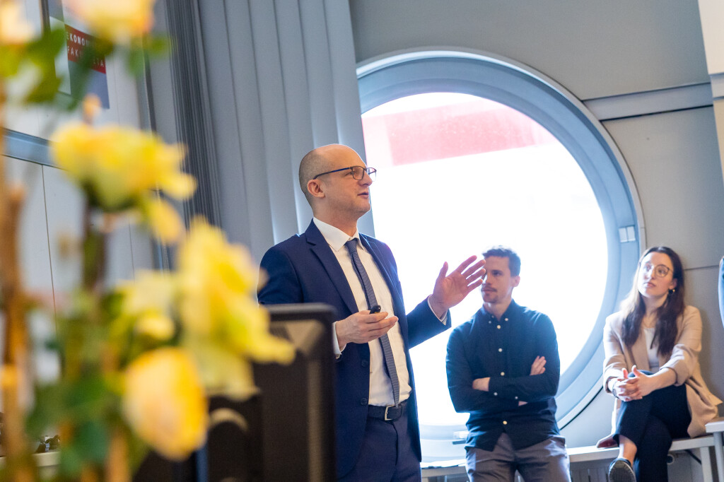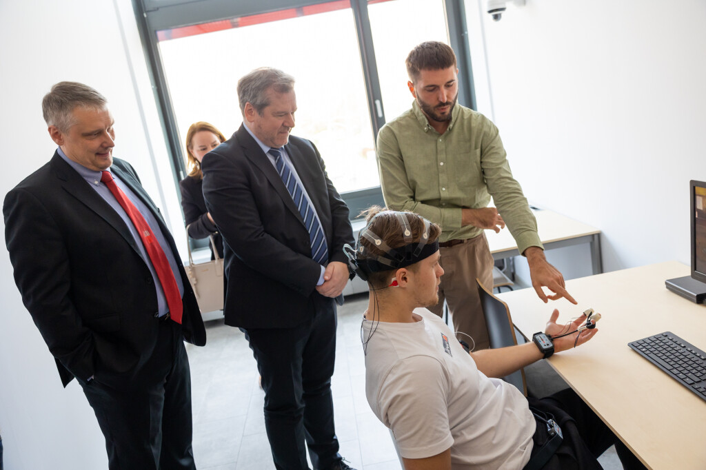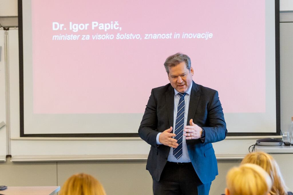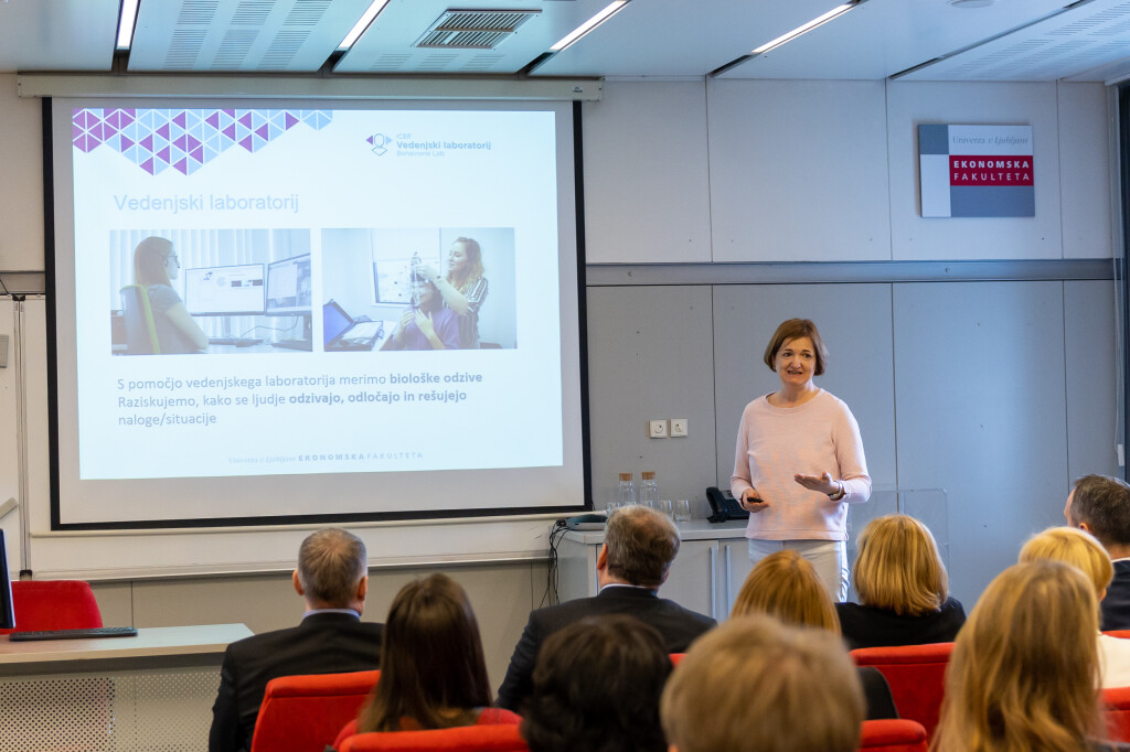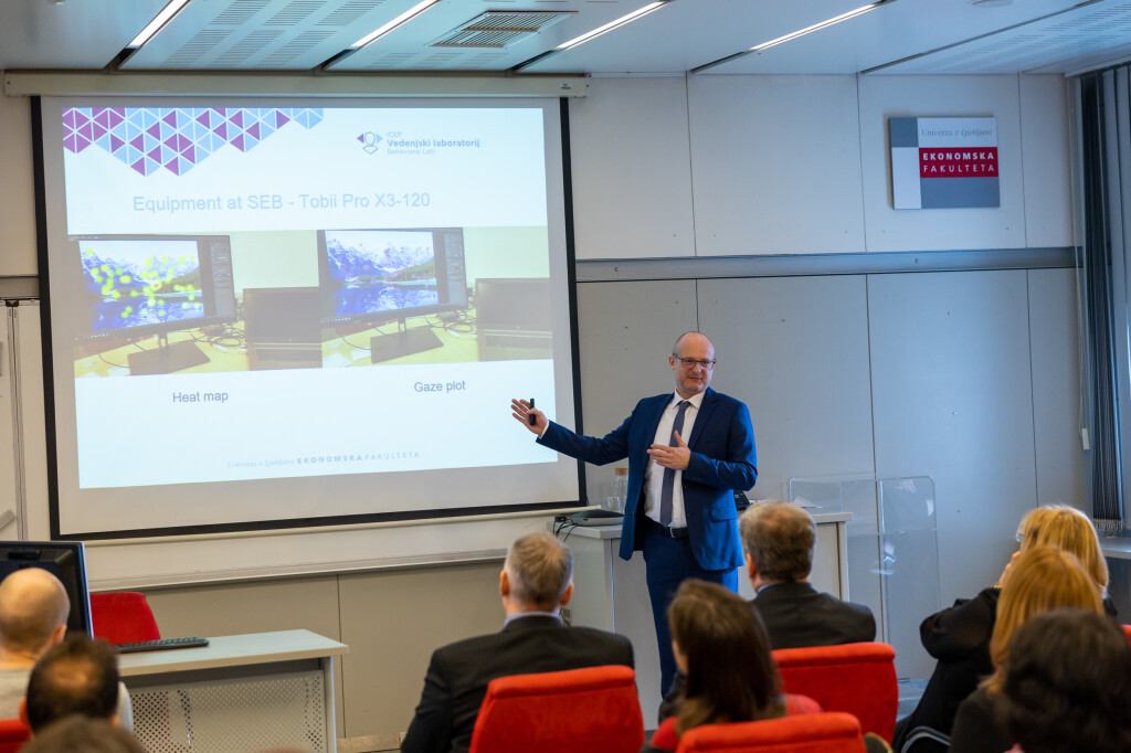 Še pred ogledom je red. prof. dr. Vesna Žabkar s Katedre za trženje predstavila Vedenjski laboratorij in razložila: »Vsebuje dejanske elektrotehnične naprave za merjenje bioloških odzivov, s čimer želimo narediti korak naprej od iti naprej od dosedanjega merjenja z vprašalniki.« Red. prof. dr. Aljoša Valentinčič s Katedre za denar in finance je izpostavil potrebe po finančnem laboratoriju: »Pred nami se odvija finančna kriza, kjer imamo težave z banko SVB …, za katero domnevno ni bilo indikacij. A če pogledamo finančne podatke v našem novem finančnem laboratoriju in odpremo enega od teh podekranov, pravzaprav vidimo, da je vse bilo zapisano.«