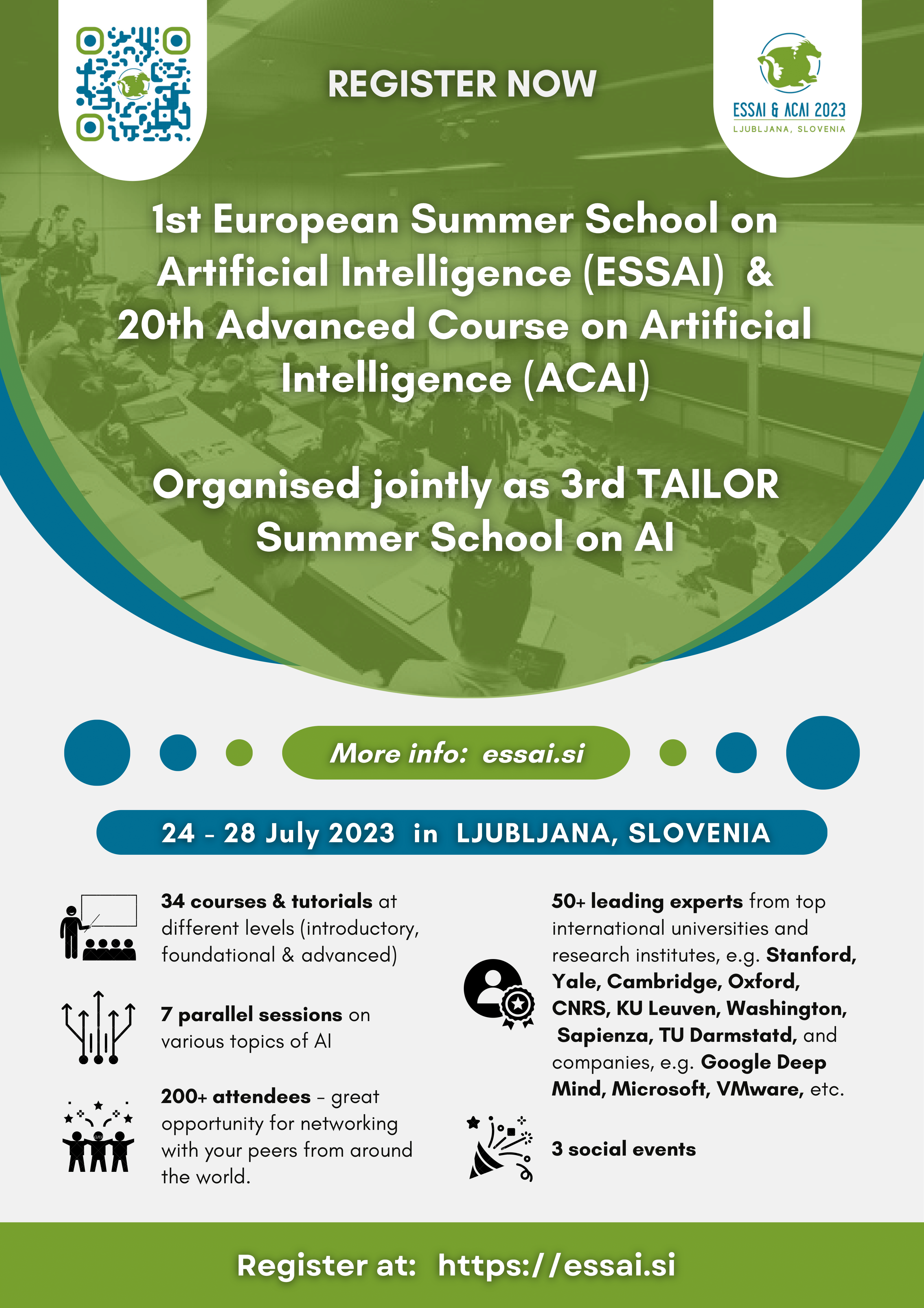 Na Fakulteti za računalništvo in informatiko Univerze v Ljubljani, letos organizirajo prvo Evropsko poletno šolo umetne inteligence, ki vključuje 20. Napredni tečaj umetne inteligence – ESSAI & ACAI 2023 pod okriljem Evropskega združenja za umetno inteligenco – EurAI. Šola bo potekala med 24. in 28. julijem 2023.