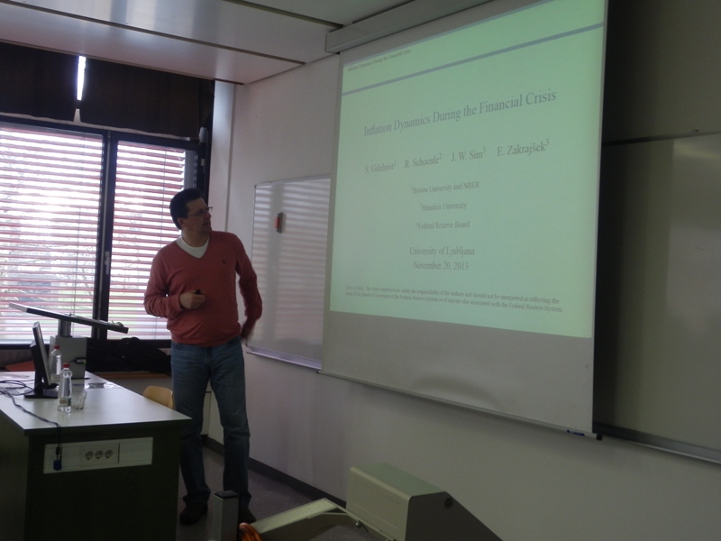 - on Wednesday, 20th November 2013 at the Faculty of Economics Ljubljana. Egon Zakrajšek, Federal Reserve Board (together with: Simon Gilchrist, Boston University; Raphael Schoenle, Brandeis University; Jae W. Sim, Federal Reserve Board) presented an article: “Inflation Dynamics During the Financial Crisis”.