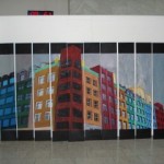 The main attraction of the exhibit are the amazing multiple canvas paintings that create a larger image when hung together, one of a city and one of a bridge. These amazing paintings are the work of 12 artists, as each canvas that makes up the larger image, was painted by a different artists, Žana Banov Ribnikar, Breda Čuk, Pšenica Kovačič, Marija Dvanajščak, Orkar Arko, Maja Zorec, Pia Zavratnik, Irena Armanini, Nataša Druškovič, Andreja Čeligoj, Nina Damjanič, Duško Rupčič. It took five years to complete the works (2005-2010) and they are a part of a bigger exhibit called Cinemascope, which has been shown in Italy and Austria, as well as in Slovenia. The artists are a part of the group 12th stroke (Slikarska skupina 12.poteza). These two pieces are very unusual, as most painters work alone, while these artists worked together to create something amazing.