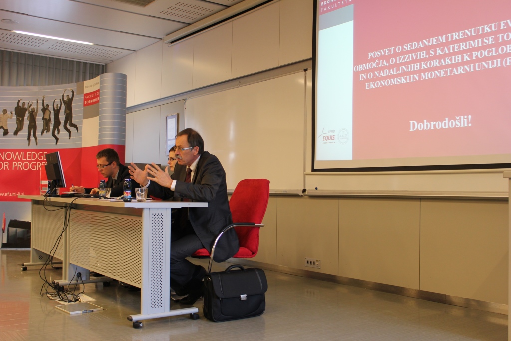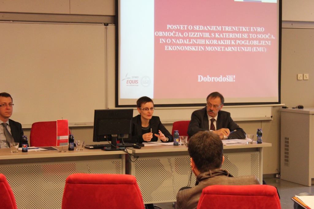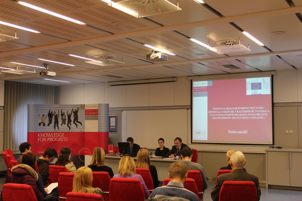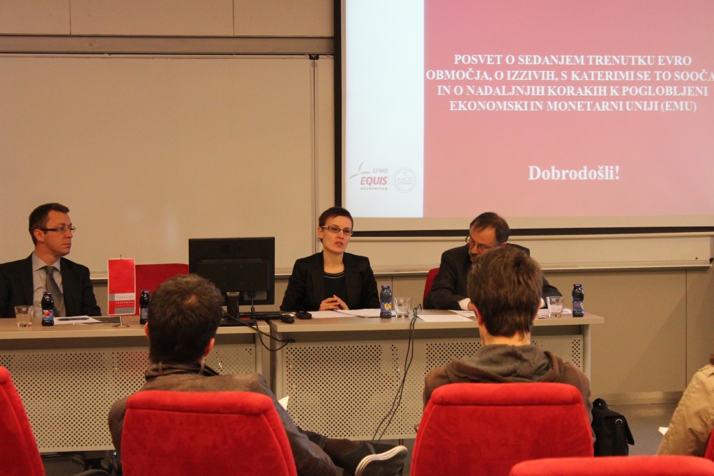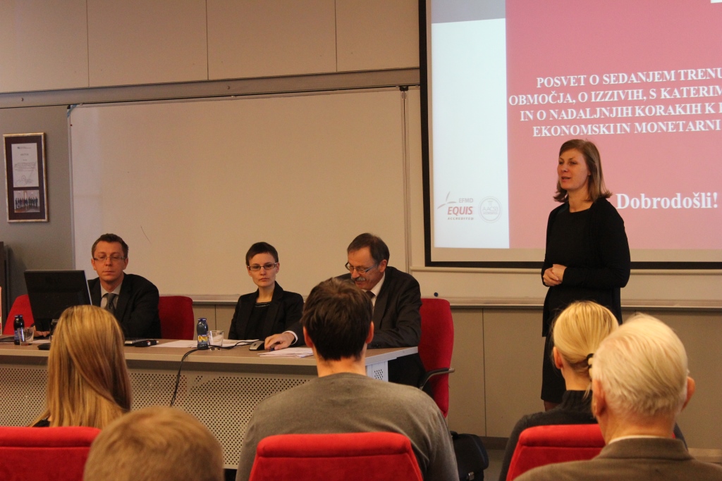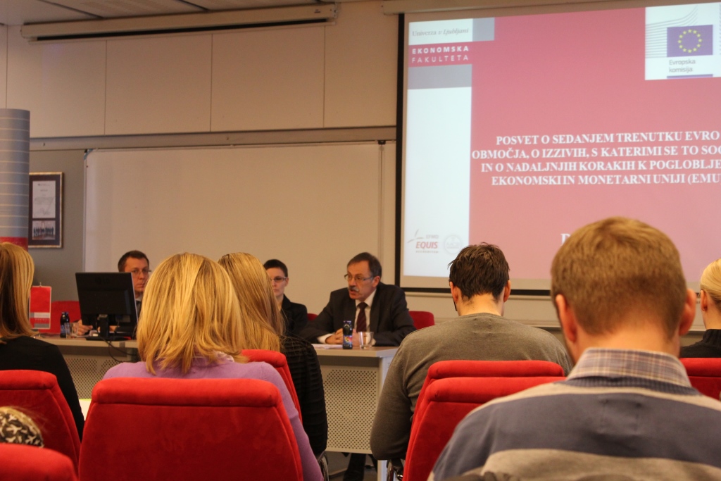 ON Thursday, 19.3.2015 the Jean Monnet Chair at the Faculty of Economics and the European Commission Representation in Slovenia held a discussion on the Current Situation of the Euro Area, the Challenges it Faces, and Further Steps Towards Deeper Economic and Monetary Union (EMU). The debate was motivated by statements made by European Commission President Jean-Claude Junker, President of the European Council, Donald Tusk, President of the Euro group Jeroen Dijsselbloem and President of the European Central Bank (ECB), Mario Draghi in their “Analytical Note” titled: “Preparing for Next Steps on Better Economic Governance in the Euro Area”. Introductory presentations were given by prof. dr. Mojmir Mrak, Jean Monnet Chair Professor at the Faculty of Economics and Katja Novak, from the Ministry of Finance of the Republic of Slovenia.