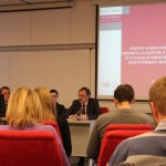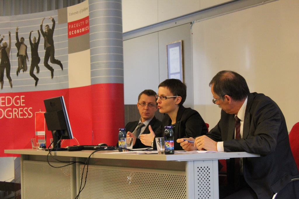 Ms. Katja Novak from the Ministry of Finance presented the details of the reforms of the Pact for Stability and Growth introduced through so-called “six pack”, “two pack” and “Fiscal Compact” measures. She explained that countries where the public finance deficit exceeds 3 % of GDP are put under the excessive budgetary pressure and have to commit themselves to reduce the deficit over a determined period of time. Similar surveillance procedures are also being applied for excessive macroeconomic imbalances. Slovenia was under both procedures in recent years, but has recently succeeded, as the first case of this kind, to improve its status on the macroeconomic imbalances ladder. For 2015, Slovenia also adopted a budget that will bring its public finance deficit to a level below the 3% of GDP.