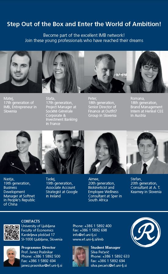 On the 19th May 2015, the Faculty of Economics hosted the second information session on the International Full Time Master Programme in Business Administration – IMB . The IMB programme is an intensive master’s programme whose emphasis lies on teamwork, dedication and real-life case studies and discussions. The information session hosted by student manager Silva Pečarič, with the help of the programme’s director founder, prof. Janez Prašnikar.