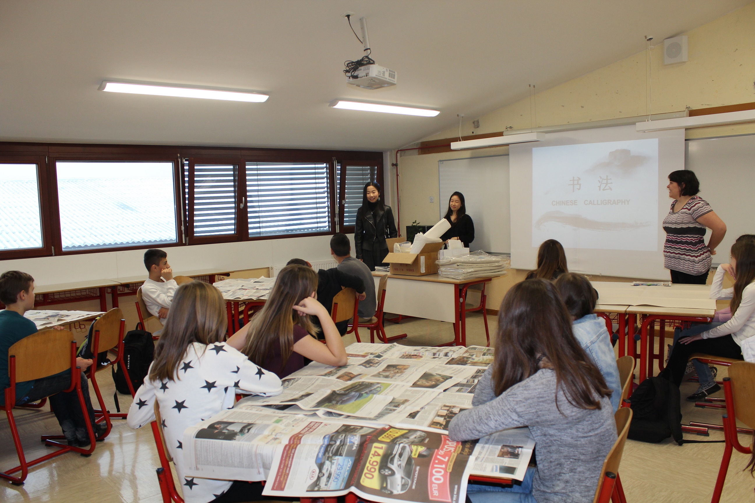 In the workshop, volunteer teachers briefly introduced the creation and development of Chinese characters, presented different calligraphy works and taught how to use “the Four Treasures of the Study”. It was their first time to study Chinese, so they were excited. Students in higher classes, they also learned some differences between Chinese and Slovenian culture, simple Chinese greetings and a Chinese children song.
