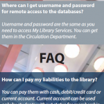 A: Username and password are the same as you need to access My Library Services. You can get them in the Circulation Department.