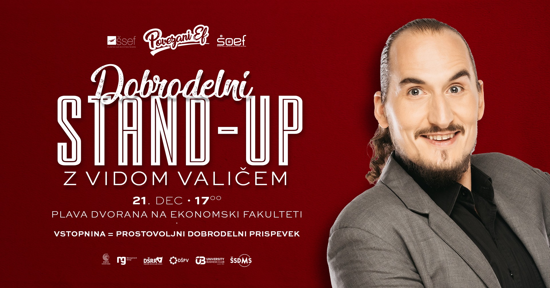 On Thursday, 21 December, the now traditional charity standup event took place at the School of Economics and Business, University of Ljubljana, which was organized as part of the charity week by Povezani EF and student associations of the SEB LU. This year we were entertained by the famous Slovenian comedian Vid Valič. The event occurred in the Great Hall, which was bursting at the seams, as around 400 spectators attended.