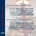 We look forward to your company in our festively decorated library until Tuesday, 24 December 2024, when the CEK is open until 3 pm.