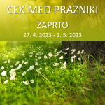 Centralna ekonomska knjižnica bo med prazniki, od četrtka, 27. aprila do vključno torka, 2. maja 2023, zaprta. Zamudnina se za dni, ko je knjižnica zaprta, ne obračunava. Seveda pa lahko tudi v tem času oddaljeno dostopate do številnih e-člankov, e-knjig in e-revij v Digi*CEK. Veliko koristnih napotkov o knjižnici, e-virih in oddaljenem dostopu najdete na eTutor*CEK.