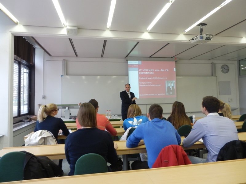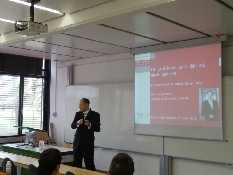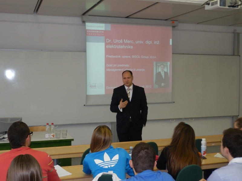V ponedeljek, 23.4.2012 smo pri predmetu Management učenja in znanja na dodiplomski ravni pod nosilstvom prof. dr. Vlada Dimovskega gostili dr. Uroša Merca, predsednika uprave podjetja BISOL Group, d.o.o., edine slovenske družbe, ki na masovni industrijski ravni proizvaja fotonapetostne module najvišje kakovosti. V svojem interaktivnem in izredno razgibanem predavanju je dr. Merc spregovoril o težkih začetkih svojega podjetja, o značilnostih panoge, v kateri podjetje deluje,o zanimivih poslovnih prigodkih širom sveta ter o načrtih za prihodnost. V okviru predavanja je ugledni gost spregovoril tudi o izobraževanju in prenosu znanja znotraj podjetja ter med zaposlenimi v podjetju in ostalimi pomembnimi deležniki v okviru njihovega poslovnega procesa (distributerji, inštalaterji). S svojimi bogatimi izkušnjami tako iz slovenskega kot tudi tujega poslovnega prostora je obogatil pedagoški proces pri predmetu ter študentom ponudil nadvse zanimiv vpogled v poslovno prakso oz. management hitro rastočega podjetja.