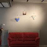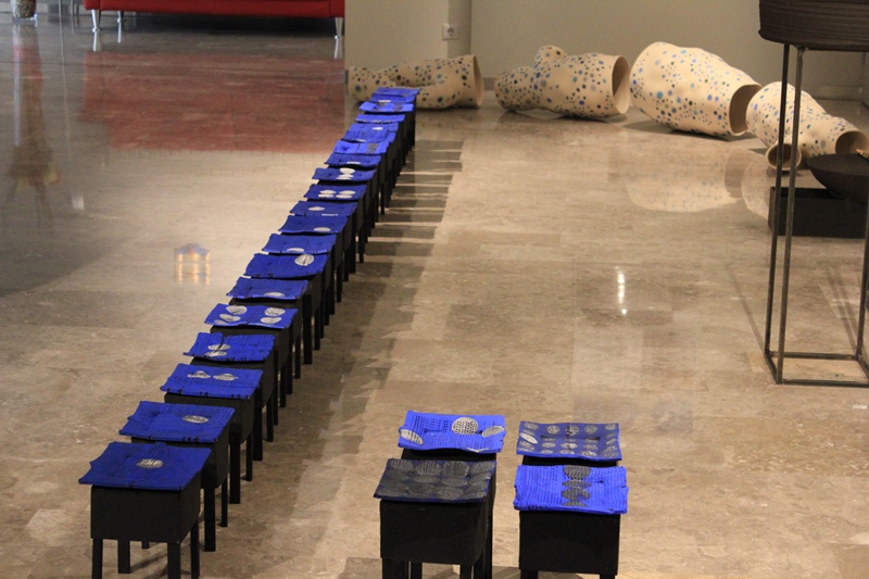 Marta Pavlinc razstavlja serijo modrih keramičnih krožnikov. Poslikani so z belimi krogi a z različno postavitvijo. Set keramični krožnikov tako zaradi »serijskosti« pritegne opazovalca, ponudi pa možnost po odkrivanju sprememb in različnosti v enakem.