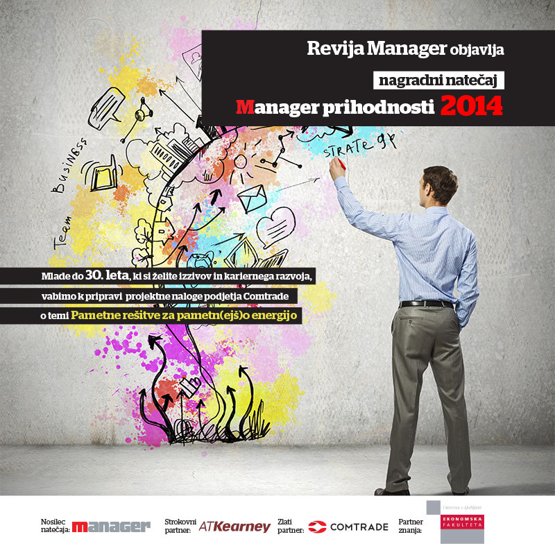 Revija Manager je v partnerstvu s svetovalnim podjetjem A. T. Kearney in podjetjem Comtrade tudi letos razpisala natečaj Manager prihodnosti na temo Pametne rešitve za pametn(ejš)o energijo – Smart solutions for smart(er) energy. Zlati partner natečaja je podjetje Comtrade, partner znanja pa Ekonomska fakulteta.