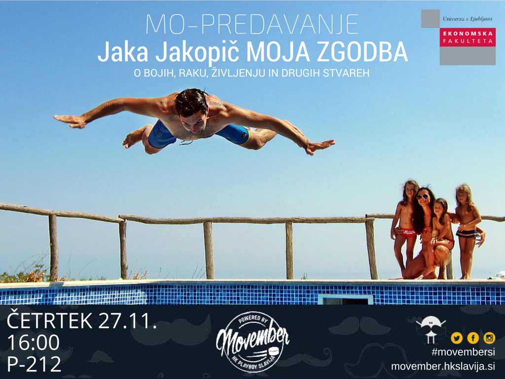V sklopu meseca Movembra se na ljubljanskih fakultetah odvijajo inspiracijska predavanja Jake Jakopiča, Moja zgodba – O bojih, preživetju, življenju in drugih stvareh, v četrtek 27.11. ob 16:00 v P-212 pa Jaka prihaja tudi na Ekonomsko Fakulteto. Jaka je kot mlad, 24-letni profesionalni nogometaš po pregledu treh otečenih bezgavk prejel grozljivo diagnozo – Hodgkinov limfom, raka na bezgavkah in 13 metastaz na pljučih. Še isti večer se je vprašal »Zakaj ravno jaz?«, nato pa se hitro namesto za samopomilovanje odločil za boj na zmago v največji tekmi njegovega življenja, tekmo v kateri je našel navdih, srečo in številna nova spoznanja, ki jih bo v zabavnem in navdihujočem govoru delil z vami. Ob Jaki bo nastopila tudi asist. mag. Mirjana Rajer, dr. med., spec. radioterapije in onkologije, ki vam bo z vami delila še pogled s strani zdravnika in informacije, ki lahko vam ali pa vašim bližnjim rešijo življenje. In ne, to ni klasično predavanje o raku, to je predavanje o življenju!