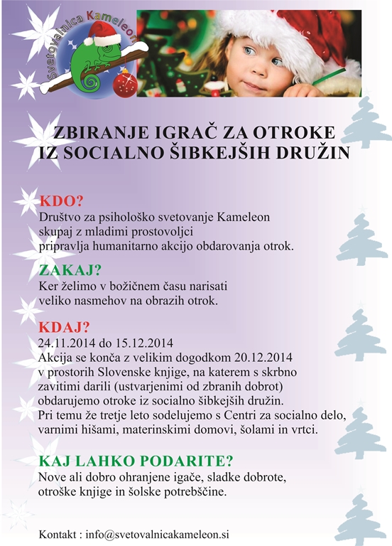 Ker se bliža praznični čas, smo se na Ekonomski fakulteti ponovno odločili za dobrodelno akcijo. Skupaj z Društvom za psihološko svetovanje Kameleon smo zbirali igrače (nove ali dobro ohranjene), šolske potrebščine, otroške knjige, otroške pripomočke (pleničke, bodije …), sladkarije. Vsak otrok bo v dar prejel univerzalno darilo, ki si ga bo izbral sam, saj bodo darila skrbno zavita v prozoren darilni papir.