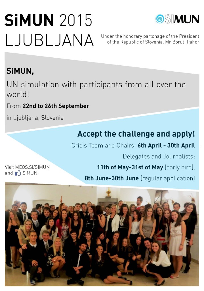 Društvo za spodbujanje in razvoj mednarodnih odnosov MEOS tudi letos organizira Simulacijo Združenih narodov – SiMUN, na kateri se udeleženci z vsega sveta soočajo s kriznimi situacijami in iščejo odgovore na vprašanja iz področja mednarodnih odnosov. Letos že osma simulacija bo potekala od 22. do 26. septembra 2015, na Fakulteti za družbene vede v Ljubljani.