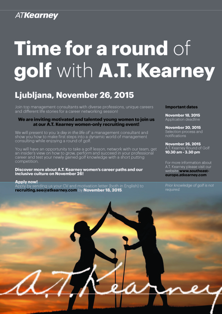 A.T. Kearney vabi vse, ki vas zanima kariera v poslovnem svetovanju, na simpatičen tečaj golfa, kjer boste imele priliko mreženja z njihovo ekipo in pridobiti koristne »insajderske« informacije o tem kako rasti, se dobro odrezati in uspeti na svoji karierni poti.
