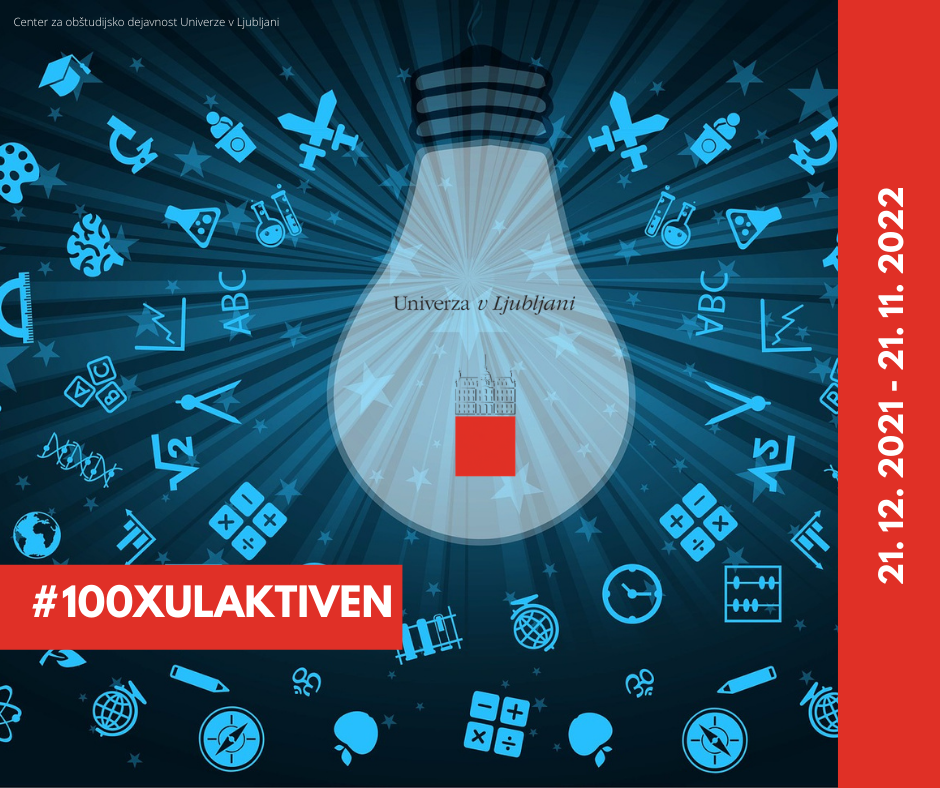 Univerza v Ljubljani, Center za obštudijsko dejavnost, objavlja natečaj #100xULaktiven. Namen natečaja je čim večja vključenost študentov v obštudijske dejavnosti, ki vam omogočajo pridobitev in krepitev novih znanj ter kompetenc. Študenti, ki boste 100-krat obštudijsko aktivni v obdobju od 21. 12. 2021 do 21. 11. 2022, boste na gala univerzitetnem plesu prejeli priznanje rektorja Univerze v Ljubljani ter praktične univerzitetne nagrade.