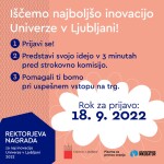 Iščemo najboljšo inovacijo Univerze v Ljubljani v letu 2022. Rektorjeva nagrada je tradicionalno tekmovanje, ki spodbuja inoviranje na Univerzi v Ljubljani in pomaga inovatorjem na poti do trga. Organizirata ga Univerza v Ljubljani (UL) in Ljubljanski univerzitetni inkubator (LUI). Že tretje leto zapored smo tekmovanje razdelili v dve kategoriji, kategorijo študentk/študentov in alumen/alumnov ter kategorijo raziskovalk/raziskovalcev, redno zaposlenih na Univerzi v Ljubljani. K prijavi vabimo vse, ki imate tehnološke ali netehnološke inovacije in inovativne podjetniške ideje. Rok za prijavo je 18. september 2022 do 23.59 ure. Svoje inovacije prijavite prek spletnega obrazca.